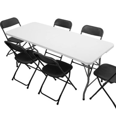 We offer 6ft rectangle tables, 6ft round tables, folding chairs, chair covers, centerpieces & much more